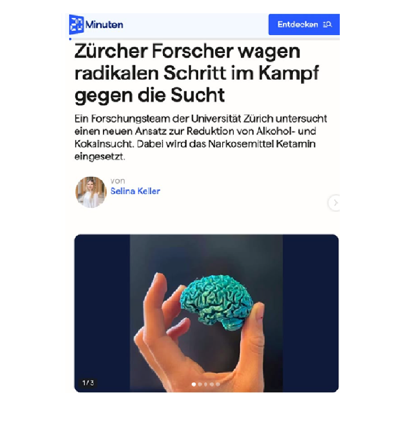 Herzlichen Dank für Ihr Interesse an unserer Studie zur Wirkung einer einmaligen Gabe von Ketamin in Kombination mit einem Neurofeedback Training zur Unterstützung der Alkoholreduktion (Entschädigung von bis zu CHF 550.-).Die Nektar Studie erforscht unter der Leitung von PD Dr. med. Marcus Herdener und PD Dr. Katrin Preller an der Psychiatrischen Universitätsklinik Zürich einen neuartigen, neurowissenschaftlich fundierten Behandlungsansatz mit dem Ziel die Therapie von Menschen mit einer Alkoholkonsumstörung (AUD) optimieren zu können.